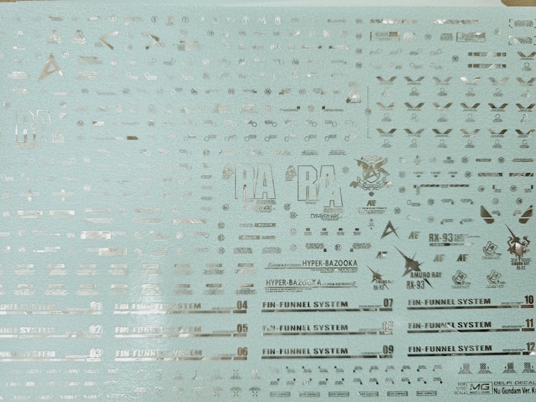 Product Overview Pre-cut decals of Hologram MG RX-93 Nu (Polygonal) NOTE: DO NOT APPLY matte coat on top of the decal as this will dull or lose the hologram effect